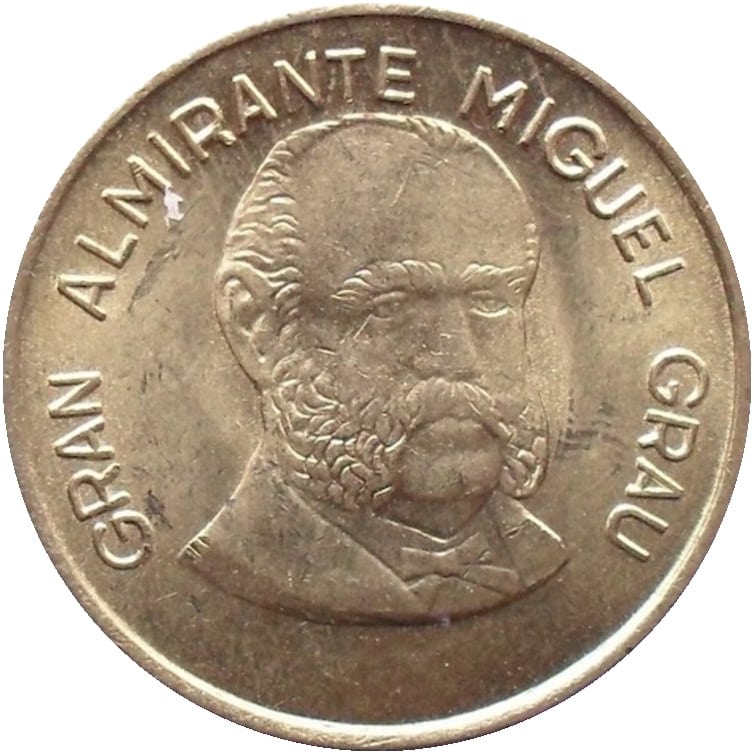 Peru 20 centimos coin, 1987. KM# 294, brass. Admiral Miguel Grau. | |