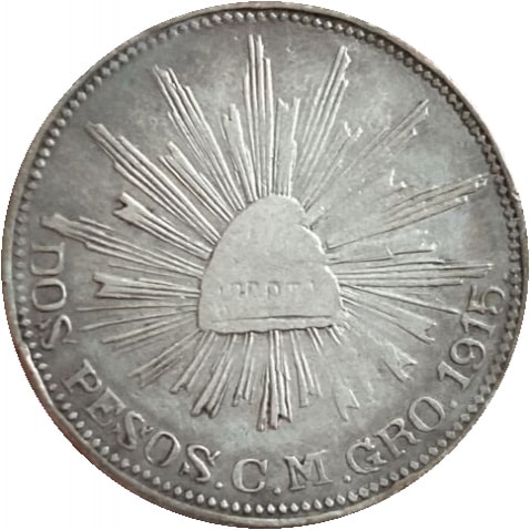 1915 Mexico Revolution Silver Gold 2 Dos Peso Large C M Gro KM662 Campo Morado b | |