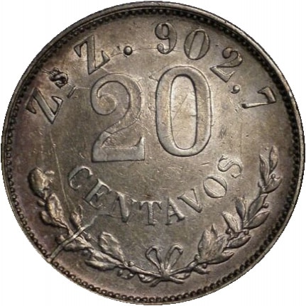 1902 Zs Z Mexico 20 Centavos / .900 Fine Silver / .1572 ASW / KM. 405.3 | |