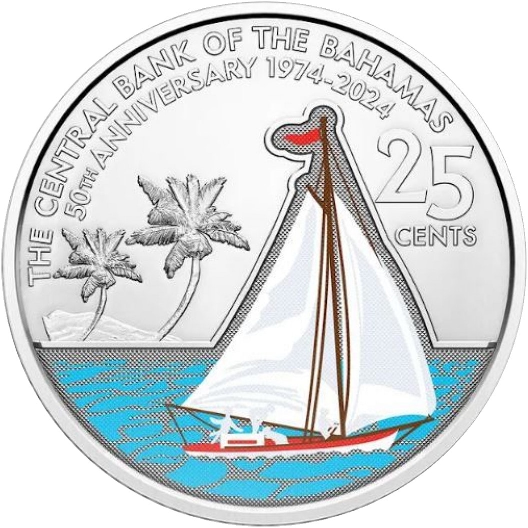 Bahamas 25 Cents, 2024, KM #251, Commemorative, Colorized BSD .25, Sailboat | |